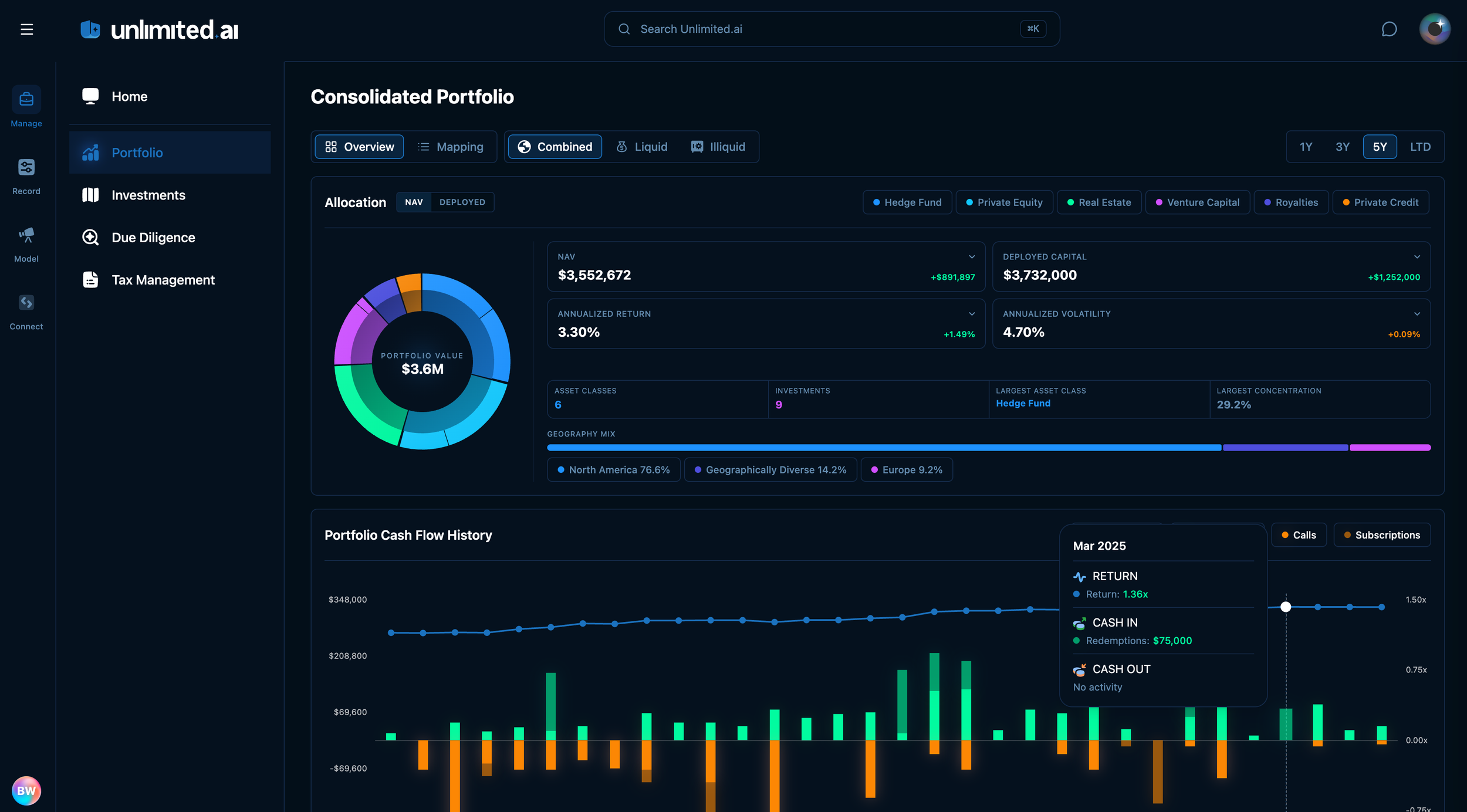 It’s time for Family Offices and RIAs to have the same tools previously only available to the most sophisticated institutional investors: interactive consolidated balance sheet reporting, due diligence insights and analytics, and integrated data and document management. All orchestrated by your team of Unlimited AI agents.